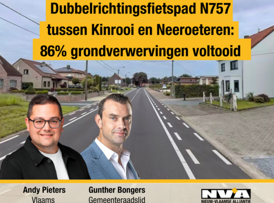 Het Agentschap Wegen en Verkeer (AWV) plant de aanleg van een vrijliggend dubbelrichtingsfietspad van 3 meter breed en 3,2 kilometer lang langs de oostzijde van de N757, de Kinrooiersteenweg tussen de kruispunten met Zielderveld (Geisteren, Kinrooi) en Oude Kuil - Tienderstraat (Neeroeteren, Maaseik). De grondverwervingen voor dit belangrijke project zijn al voor 86% voltooid. Dat blijkt uit een parlementaire vraag van Vlaams parlementslid Andy Pieters (N-VA) aan minister van Mobiliteit Annick De Ridder. Voorlopig ontbreekt echter nog een omgevingsvergunning, in afwachting van de resterende verwervingen. “Toch blijft het cruciaal dat de krachten gebundeld worden om de Kinrooiersteenweg veiliger te maken”, klinkt het bij Pieters.